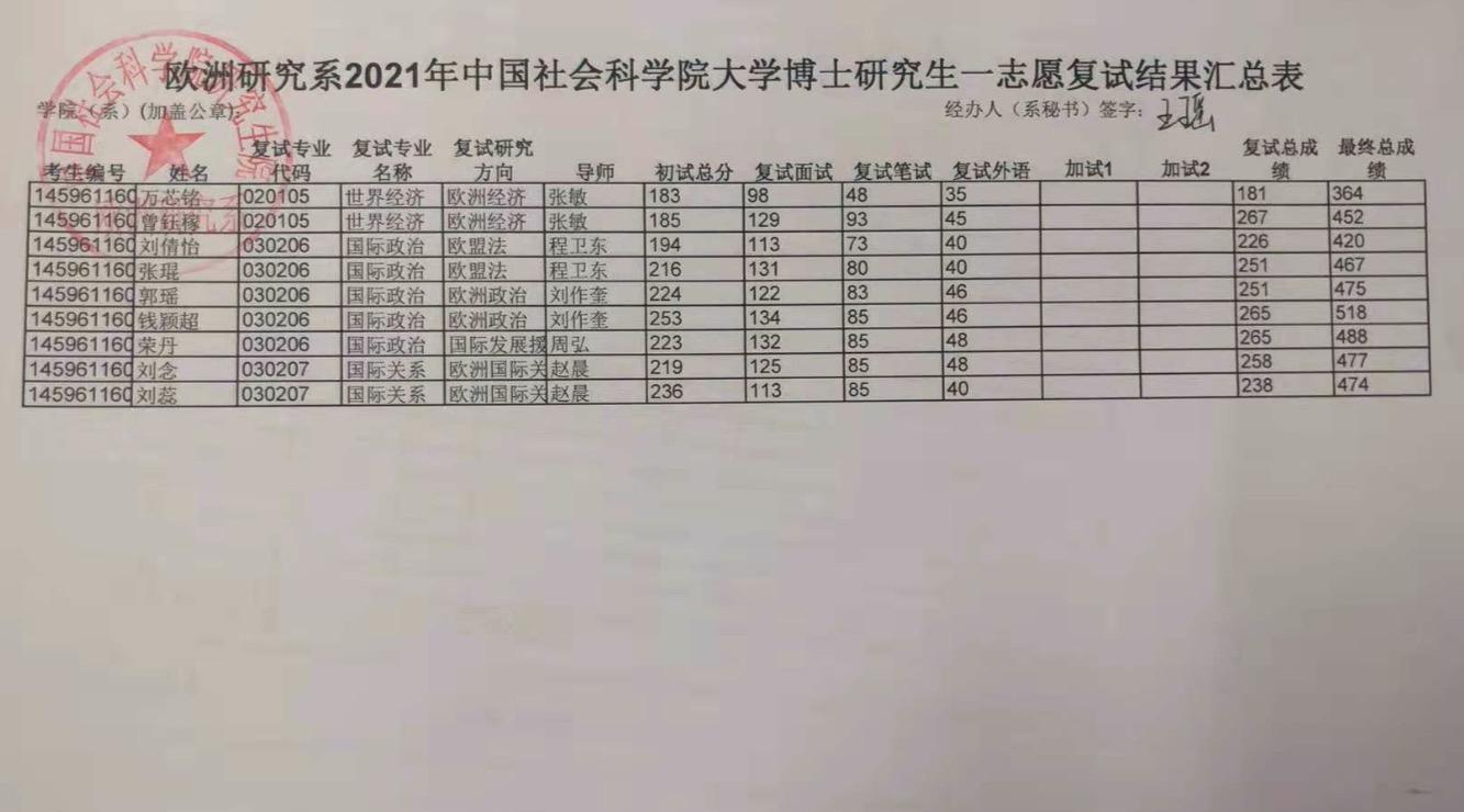 欧洲研究系2021年必威Betway安卓版大学博士研究生一志愿复试结果汇总表